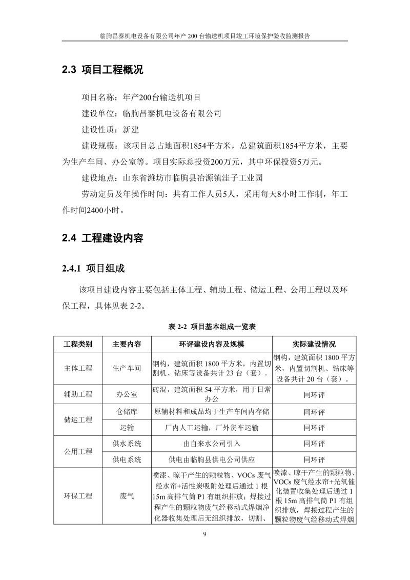 建設(shè)內(nèi)容:該項目總占地面積1854平方米,總建筑面積1854平方米,主要為生產(chǎn)車間、辦公室等。項目實際總投資200萬元,其中環(huán)保投資5萬元。切割機、鉆床等設(shè)備共計23臺(套),具備年產(chǎn)200臺輸送機的生產(chǎn)能力。